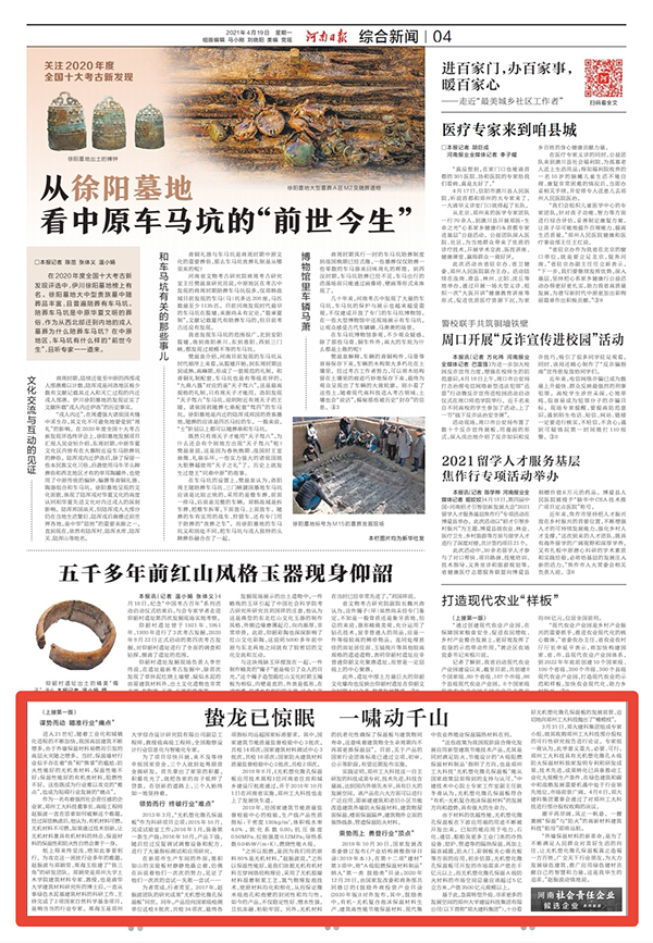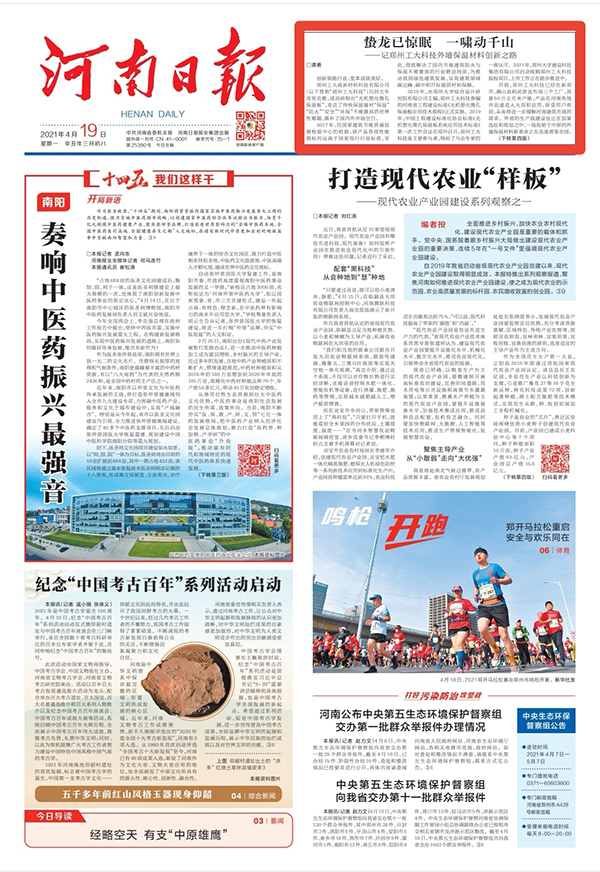 2021年4月19日,《河南日報》頭版報眼位置發表題為《蟄龍已驚眠 一嘯動千山 ——記鄭州工大科技外墻保溫材料創新之路》的文章,全方位、多層次、多角度報道了我公司“瞄準行業痛點,勇登科技高峰”的創新發展之路。