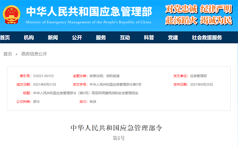 中華人民共和國(guó)應(yīng)急管理部令第5號(hào)《高層民用建筑消防安全管理規(guī)定》已經(jīng)2020年12月28日應(yīng)急管理部第39次部務(wù)會(huì)議審議通過(guò),現(xiàn)予公布,自2021年8月1日起施行。部長(zhǎng) 黃明2021年6月21日高層民用建筑消防安全管理規(guī)定第一章 總則第一條為了加強(qiáng)高層民用建筑消防安全管理,預(yù)防火災(zāi)和減少火災(zāi)危害,根據(jù)《中華人民共和國(guó)消防法》等法律、行政法規(guī)和國(guó)務(wù)院有關(guān)規(guī)定,制定本規(guī)定。第二條本規(guī)定適用于已經(jīng)建成且依法投入使用的高層民用建筑(包括高層住宅建筑和高層公共建筑)的消防安全管理。第三條高層民用建筑消防安全管理貫徹預(yù)防為主、防消結(jié)合的方針,實(shí)行消防安全責(zé)任制。建筑高度超過(guò)100米的高層民用建筑應(yīng)當(dāng)實(shí)行更加嚴(yán)格的消防安全管理。第二章 消防安全職責(zé)第四條高層民用建筑的業(yè)主、使用人是高層民用建筑消防安全責(zé)任主體,對(duì)高層民用建筑的消防安全負(fù)責(zé)。高層民用建筑的業(yè)主、使用人是單位的,其法定代表人或者主要負(fù)責(zé)人是本單位的消防安全責(zé)任人。高層民用建筑的業(yè)主、使用人可以委托物業(yè)服務(wù)企業(yè)或者消防技術(shù)服務(wù)機(jī)構(gòu)等專業(yè)服務(wù)單位(以下統(tǒng)稱消防服務(wù)單位)提供消防安全服務(wù),并應(yīng)當(dāng)在服務(wù)合同中約定消防安全服務(wù)的具體內(nèi)容。第五條同一高層民用建筑有兩個(gè)及以上業(yè)主、使用人的,各業(yè)主、使用人對(duì)其專有部分的消防安全負(fù)責(zé),對(duì)共有部分的消防安全共同負(fù)責(zé)。同一高層民用建筑有兩個(gè)及以上業(yè)主、使用人的,應(yīng)當(dāng)共同委托物業(yè)服務(wù)企業(yè),或者明確一個(gè)業(yè)主、使用人作為統(tǒng)一管理人,對(duì)共有部分的消防安全實(shí)行統(tǒng)一管理,協(xié)調(diào)、指導(dǎo)業(yè)主、使用人共同做好整棟建筑的消防安全工作,并通過(guò)書(shū)面形式約定各方消防安全責(zé)任。第六條高層民用建筑以承包、租賃或者委托經(jīng)營(yíng)、管理等形式交由承包人、承租人、經(jīng)營(yíng)管理人使用的,當(dāng)事人在訂立承包、租賃、委托管理等合同時(shí),應(yīng)當(dāng)明確各方消防安全責(zé)任。委托方、出租方依照法律規(guī)定,可以對(duì)承包方、承租方、受托方的消防安全工作統(tǒng)一協(xié)調(diào)、管理。實(shí)行承包、租賃或者委托經(jīng)營(yíng)、管理時(shí),業(yè)主應(yīng)當(dāng)提供符合消防安全要求的建筑物,督促使用人加強(qiáng)消防安全管理。第七條高層公共建筑的業(yè)主單位、使用單位應(yīng)當(dāng)履行下列消防安全職責(zé):(一)遵守消防法律法規(guī),建立和落實(shí)消防安全管理制度;(二)明確消防安全管理機(jī)構(gòu)或者消防安全管理人員;(三)組織開(kāi)展防火巡查、檢查,及時(shí)消除火災(zāi)隱患;(四)確保疏散通道、安全出口、消防車(chē)通道暢通;(五)對(duì)建筑消防設(shè)施、器材定期進(jìn)行檢驗(yàn)、維修,確保完好有效;(六)組織消防宣傳教育培訓(xùn),制定滅火和應(yīng)急疏散預(yù)案,定期組織消防演練;(七)按照規(guī)定建立專職消防隊(duì)、志愿消防隊(duì)(微型消防站)等消防組織;(八)法律、法規(guī)規(guī)定的其他消防安全職責(zé)。委托物業(yè)服務(wù)企業(yè),或者明確統(tǒng)一管理人實(shí)施消防安全管理的,物業(yè)服務(wù)企業(yè)或者統(tǒng)一管理人應(yīng)當(dāng)按照約定履行前款規(guī)定的消防安全職責(zé),業(yè)主單位、使用單位應(yīng)當(dāng)督促并配合物業(yè)服務(wù)企業(yè)或者統(tǒng)一管理人做好消防安全工作。第八條高層公共建筑的業(yè)主、使用人、物業(yè)服務(wù)企業(yè)或者統(tǒng)一管理人應(yīng)當(dāng)明確專人擔(dān)任消防安全管理人,負(fù)責(zé)整棟建筑的消防安全管理工作,并在建筑顯著位置公示其姓名、聯(lián)系方式和消防安全管理職責(zé)。高層公共建筑的消防安全管理人應(yīng)當(dāng)履行下列消防安全管理職責(zé):(一)擬訂年度消防工作計(jì)劃,組織實(shí)施日常消防安全管理工作;(二)組織開(kāi)展防火檢查、巡查和火災(zāi)隱患整改工作;(三)組織實(shí)施對(duì)建筑共用消防設(shè)施設(shè)備的維護(hù)保養(yǎng);(四)管理專職消防隊(duì)、志愿消防隊(duì)(微型消防站)等消防組織;(五)組織開(kāi)展消防安全的宣傳教育和培訓(xùn);(六)組織編制滅火和應(yīng)急疏散綜合預(yù)案并開(kāi)展演練。高層公共建筑的消防安全管理人應(yīng)當(dāng)具備與其職責(zé)相適應(yīng)的消防安全知識(shí)和管理能力。對(duì)建筑高度超過(guò)100米的高層公共建筑,鼓勵(lì)有關(guān)單位聘用相應(yīng)級(jí)別的注冊(cè)消防工程師或者相關(guān)工程類中級(jí)及以上專業(yè)技術(shù)職務(wù)的人員擔(dān)任消防安全管理人。第九條高層住宅建筑的業(yè)主、使用人應(yīng)當(dāng)履行下列消防安全義務(wù):(一)遵守住宅小區(qū)防火安全公約和管理規(guī)約約定的消防安全事項(xiàng);(二)按照不動(dòng)產(chǎn)權(quán)屬證書(shū)載明的用