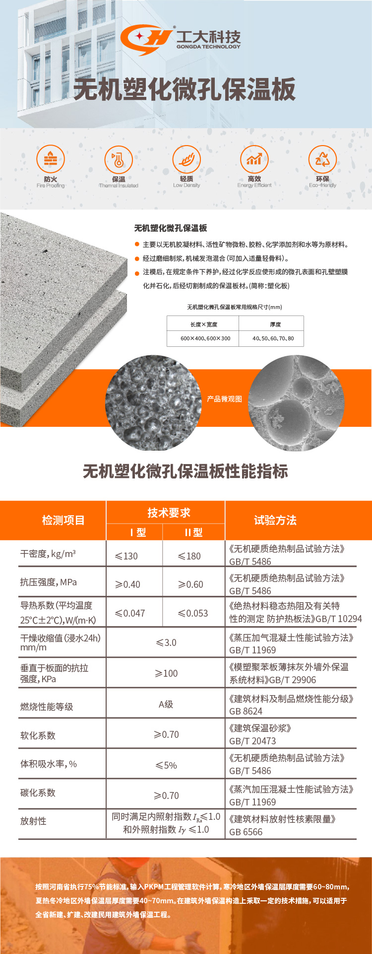 ? 無機塑化微孔保溫板是由鄭州工大高新材料科技有限公司經過7年潛心研究,具有國內領先地位和自主知識產權的最新產品。